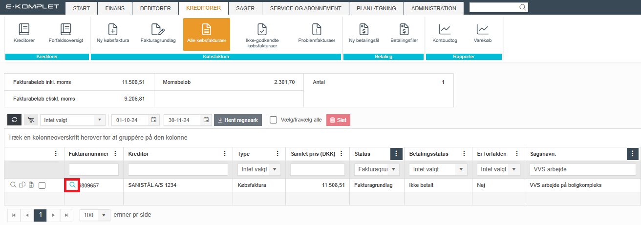 2. Søg efter den ønskede faktura. Du kan for eksempel søge efter sagsnavn, kreditor eller andre kriterier.