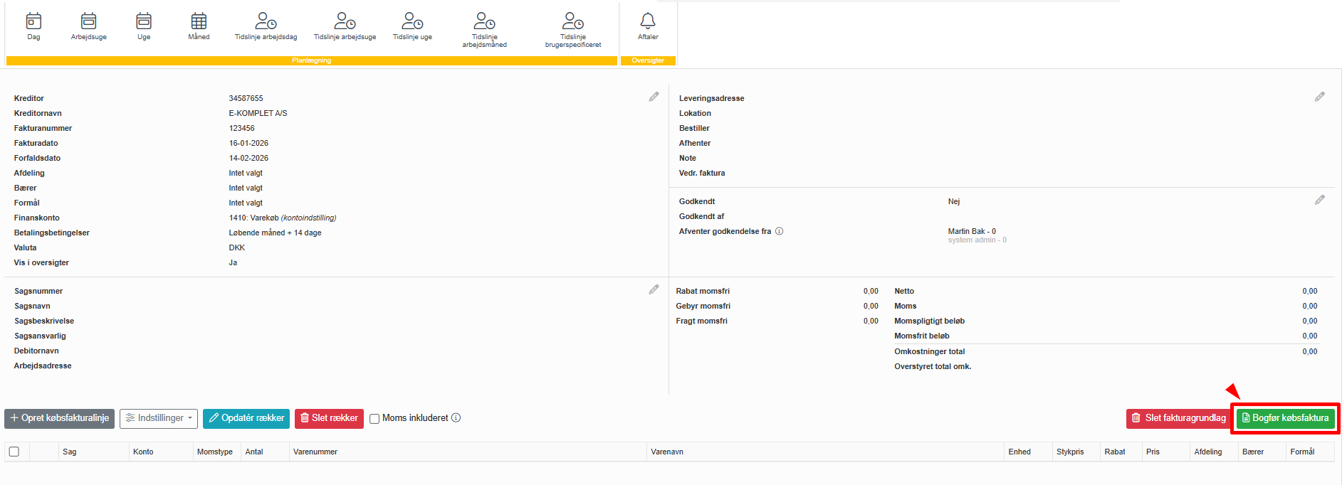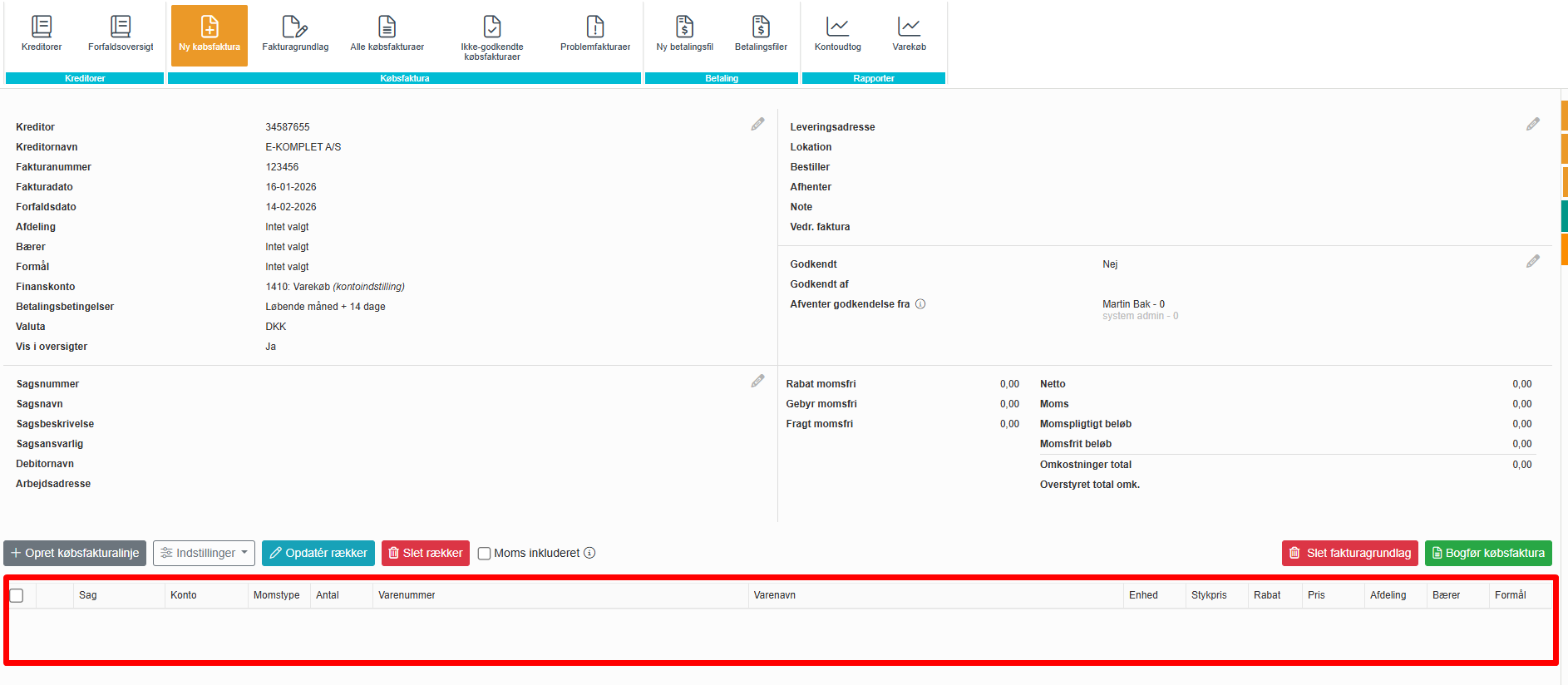 Nederst på købsfakturaen kan du redigere de eksisterende fakturalinjer og oprette nye: