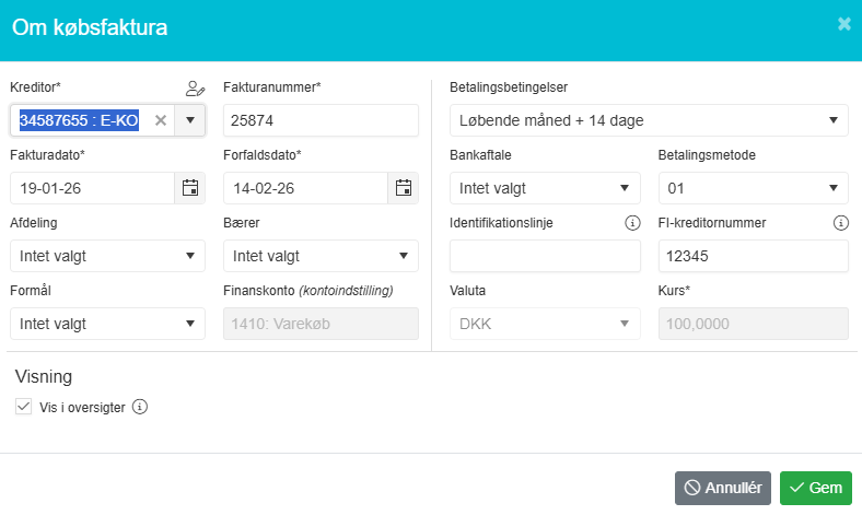 - Afdeling: Hvis I bruger afdelingsdimensionen, kan fakturaen klassificeres her.